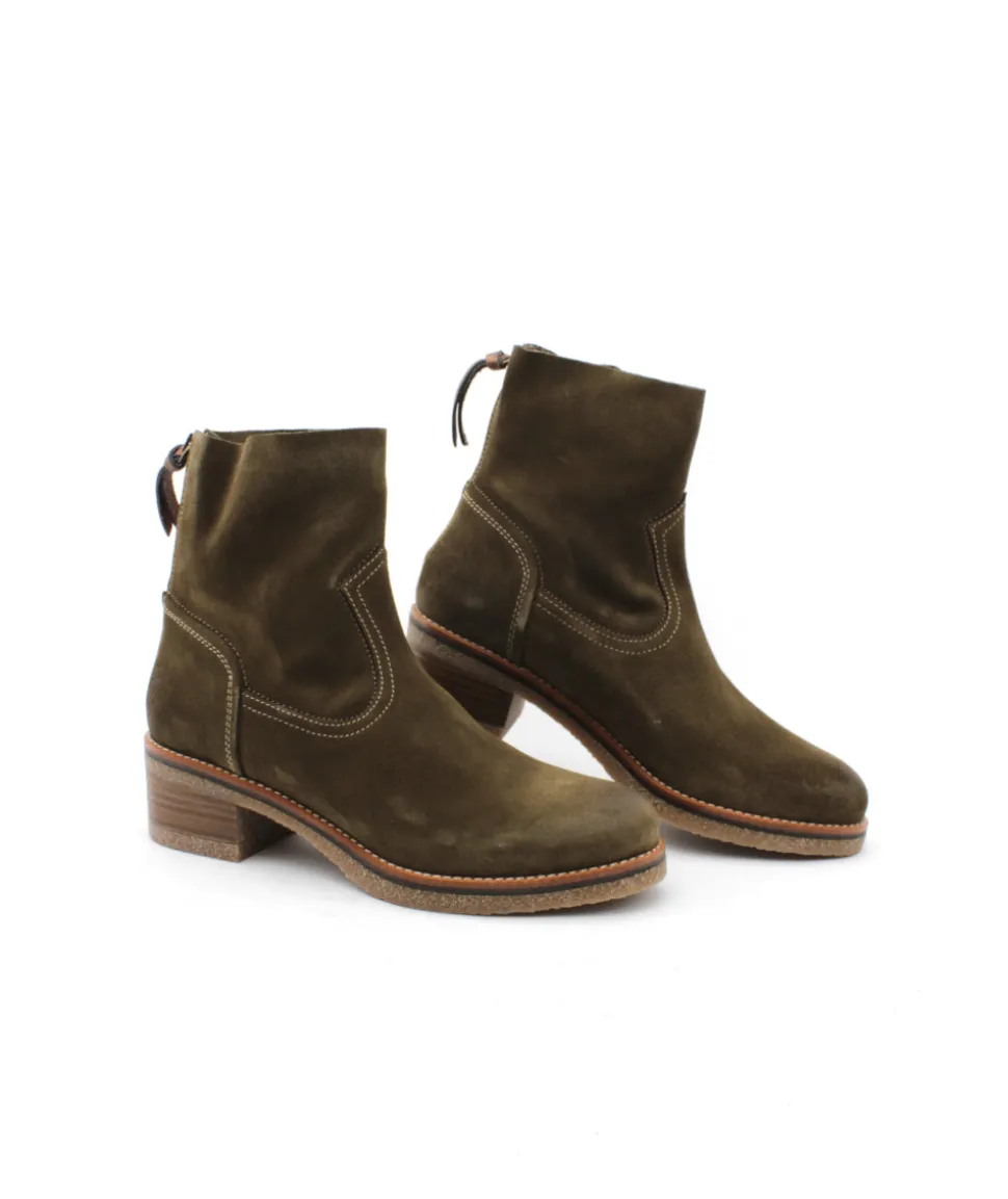 Jolie bottine de la maison MKD en cuir velours kaki. Voici le modèle PABLO OLIO et son talon décroché de 5 cm qui vous fera prendre de la hauteur tout en conservant une cambrure confortable. Son cuir souple, agréable à porter s’équipe d’un zip arrière pour plus de praticité. Sa semelle crêpe offre quant-à elle beaucoup d’amorti pour un confort de marche optimal.