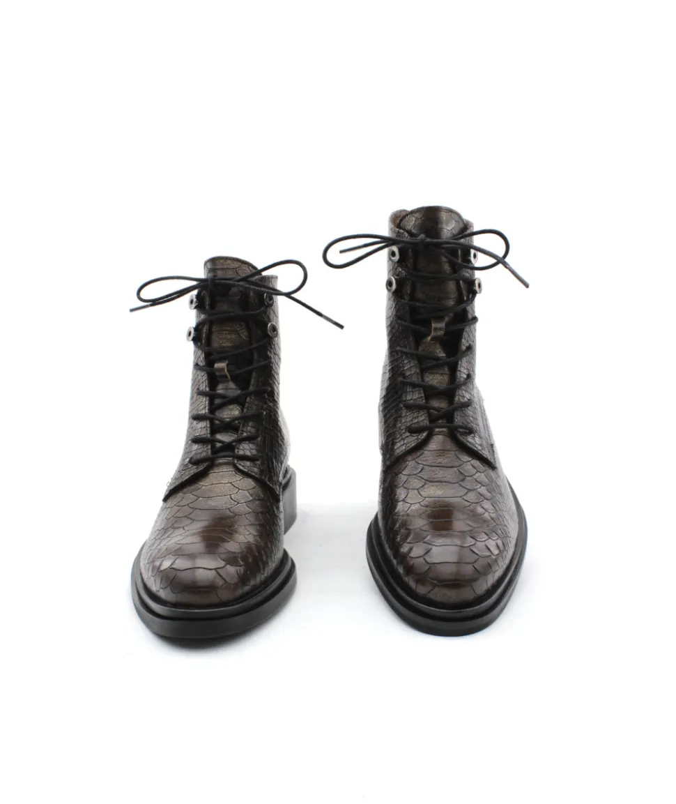 MURATTI propose cette saison une nouvelle bottine. RONAI, la petite dernière de la collection, se décline dans un sublime cuir aux impressions serpent kaki. Équipé d’un joli lacet rond ciré et d’oeillets métalliques sur le haut de la tige, on aime cette bottine pour son look chic et féminin. Son zip intérieur vous facilitera l’enfilage tandis que son lacet ajustera la bottine à votre pied. Intemporel mais toujours aussi indispensable elle mérita sa place dans votre shoesing cet hiver.