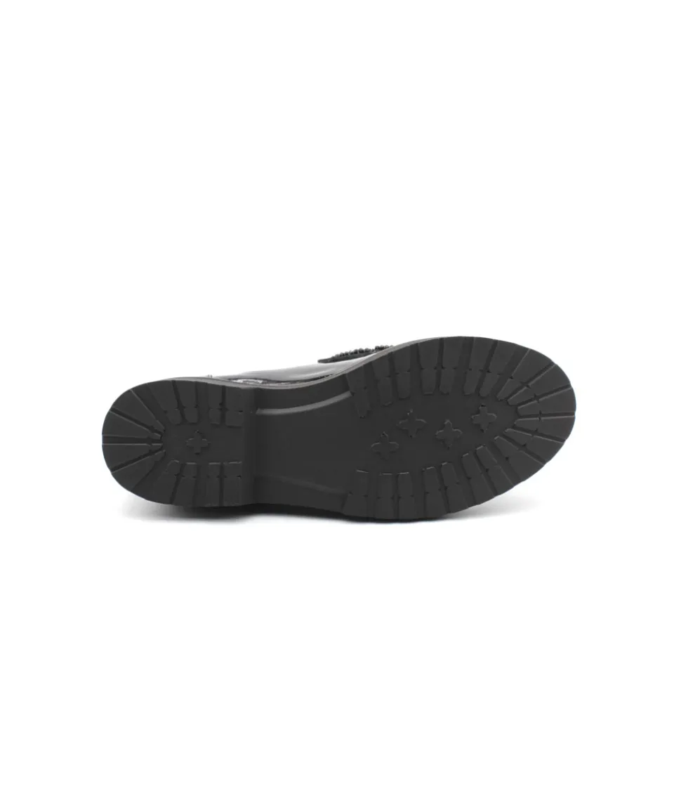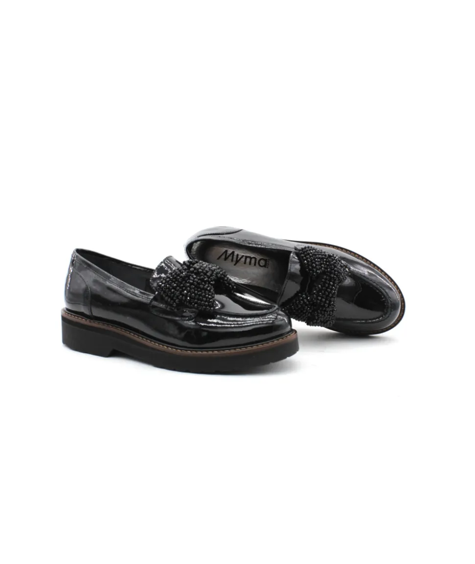 Nouvelle création de la maison française Myma avec ce mocassin en cuir vernis noir 5815/00. Un look moderne et féminin grâce à sa semelle épaisse, son cuir vernis et son noeud orné de strass. Énorme tendance, le mocassin se fait une place de choix dans le shoesing des femmes ces dernières années. Chic et raffiné, comme vous, ces chaussures s’associeront facilement à vos robes, jupes, pantalons à pinces…