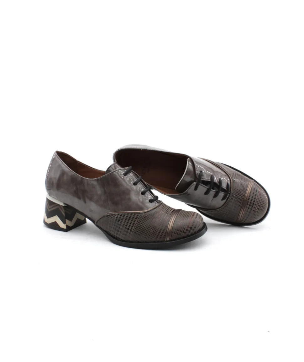 Atypique et élégant comme le reste de la collection NEMONIC, ce derbie monté sur un talon de 5 cm n’a pas fini de vous surprendre… Le modèle 2232 en cuir vernis gris / taupe, s’habille d’un superbe cuir imprimé à pois sur l’avant de la chaussure tandis que son talon se pare d’un design original et surprenant. Plein de charme, ce derbie accompagnera à de nombreuse occasions vos tenues grâce à sa couleur facile à assortir.