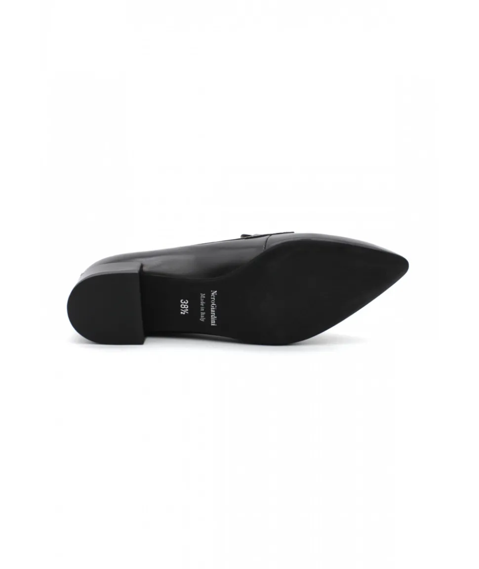 À chaque femmes sa part d’élégance. Nerogiardini a fait pour vous mesdames, le modèle 05602, iconique, indémodable et très chic, ce mocassin s’accorde parfaitement à vos tenues formelles. Un cuir noir et un bout pointu pour un style féminin, une barrette pour l’élégance et un petit talon confortable de 2 cm en gomme . Plus rien ne vous arrête !