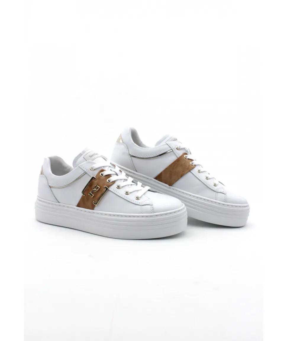 Énorme coup de coeur sur ce modèle de basket NEROGIARDINI. Le modèle 18132 apporte un rayon de soleil sur son cuir blanc grâce à ses oeillets couleur or. Légère et confortable, ces sneakers pour femmes au look casual chic vous ferons toutes craquer !