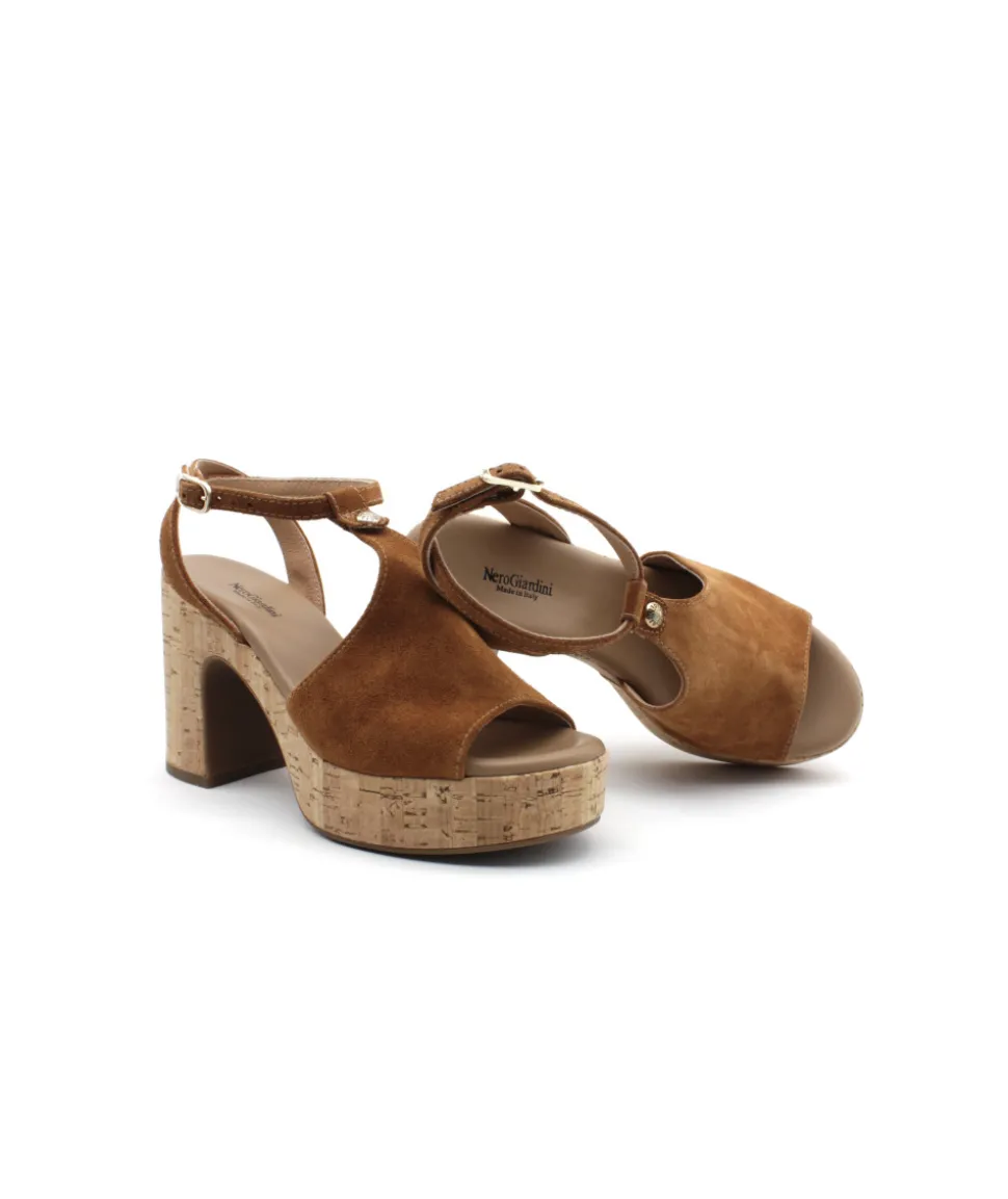 À la recherche d’une sandale à talon décroché élégante, chic et tendance ? Voici la toute dernière E307671D de la maison italienne NEROGIARDINI dans son cuir velours tabac marron. Sur un magnifique bloc en liège, ce nu-pied est le must-have de la saison estivale.