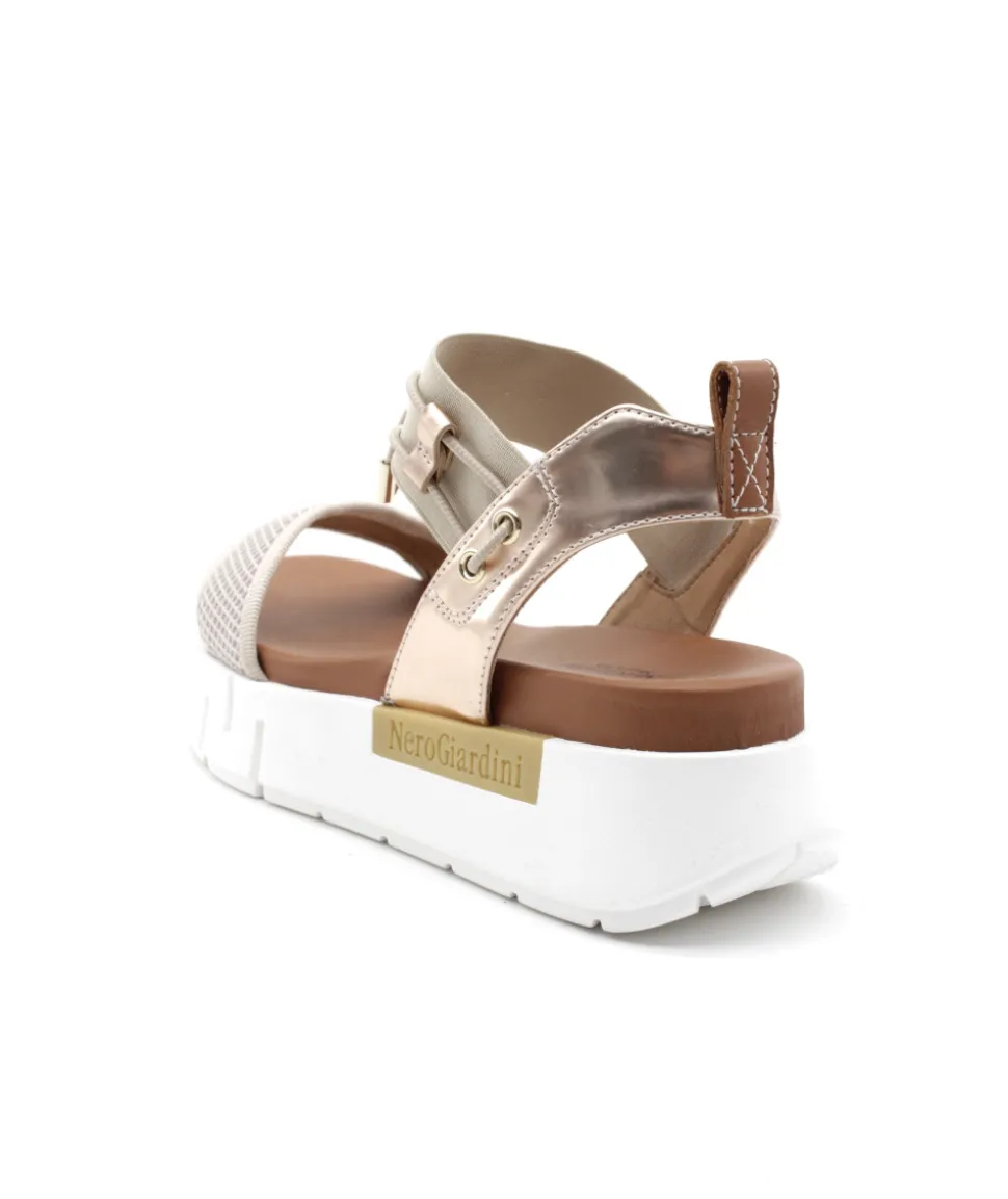 Modèle ultra-branché de la collection, la création NEROGIARDINI E410701D est le must-have de l’été avec le mélange d’une sandale et d’une semelle basket pour un look street-wear. Nude et rosegold, cette sandale arbore des brides originales élastiquées pour un rendu féminin et tendance. Entièrement doublé en cuir, le bien-être n’est pas mit de côté. Un bonheur à porter pour les modeuses comme vous !