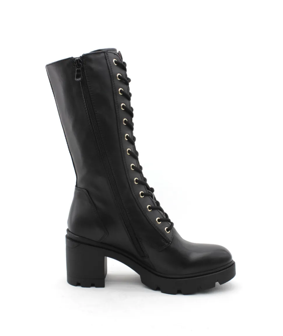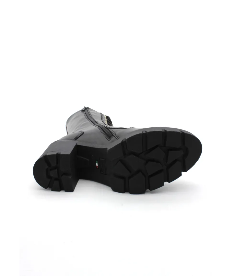 Magnifique botte pour femme en cuir noir. Voici la dernière création de la maison italienne Nerogiardini avec sa botte à lacets I205862D. Une création toute en élégance, à l’image du savoir faire italien. Perchée sur un talon de 7 cm, cette chaussure pour femme s’équipe d’un zip intérieur et de son logo version boucle décorative apposé sur le haut de la tige. Facile à enfiler grâce à son zip, vous pourrez les porter tous les jours avec chacune de vos tenues… Robes, Jeans et jupes ne seront pas en reste avec cette chaussure tendance et féminine.