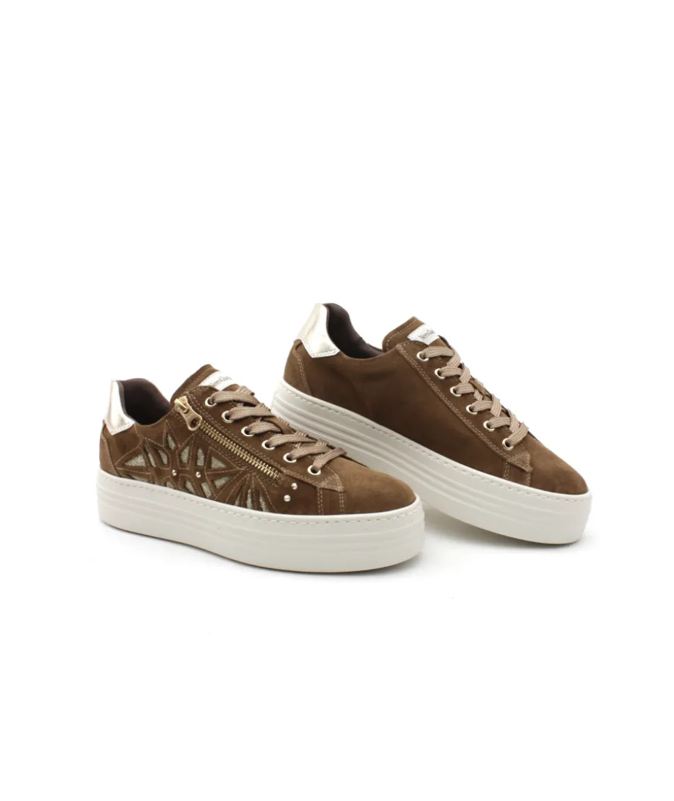 À chaque femme sa paire de basket. La maison italienne Nerogiardini nous dévoile son savoir faire avec cette sneaker I308411D et son cuir velours marron, magnifique. Le contrefort s’habille d’un cuir couleur platine. Son lacet apporte un bon maintien à votre pied dans la chaussure tandis que son zip vous facilitera l’enfilage. On aime les oeillets et le zip dorés pour un look toujours plus « sport/chic ». La touche italienne est bien présente avec des finitions soignées tel que son empiècement en cuir sur le côté et ses clous.