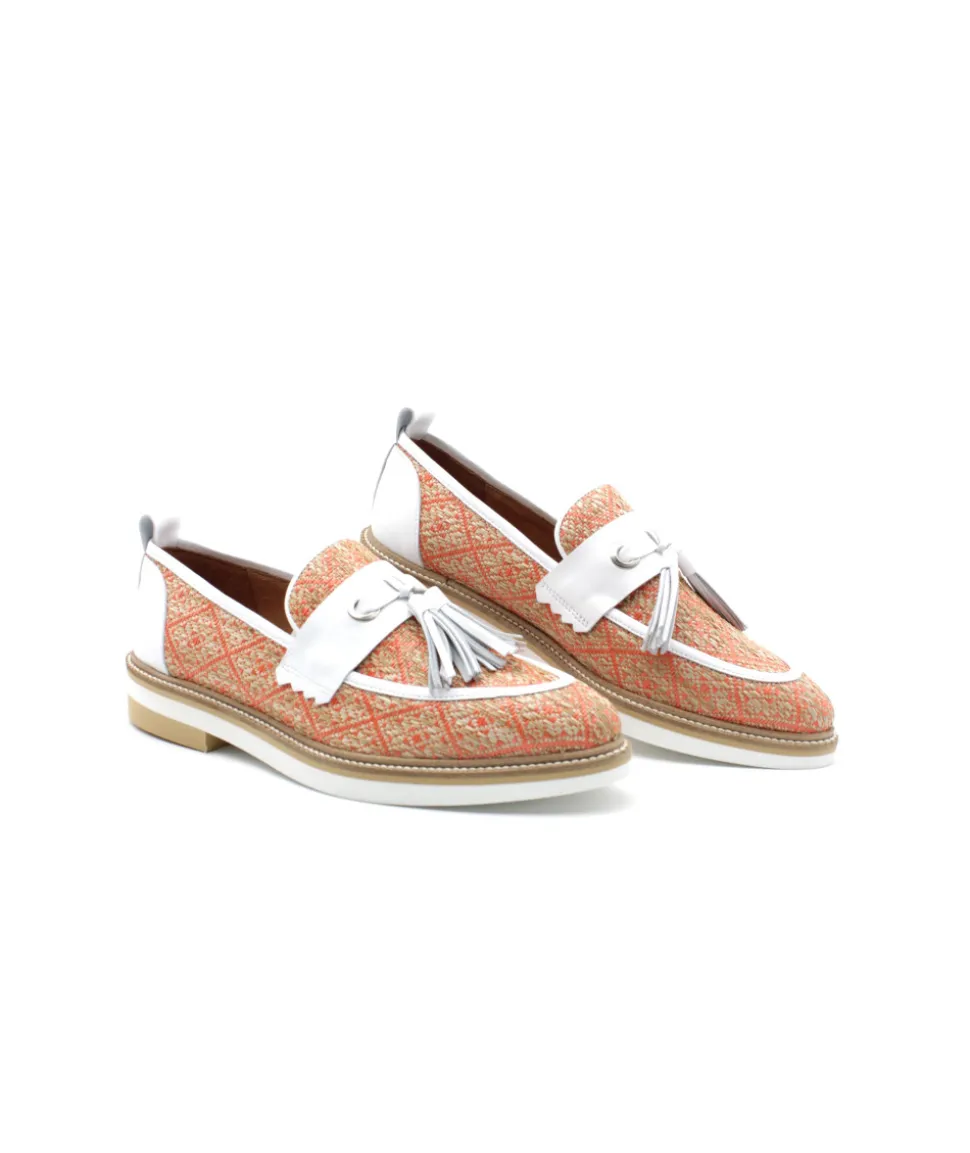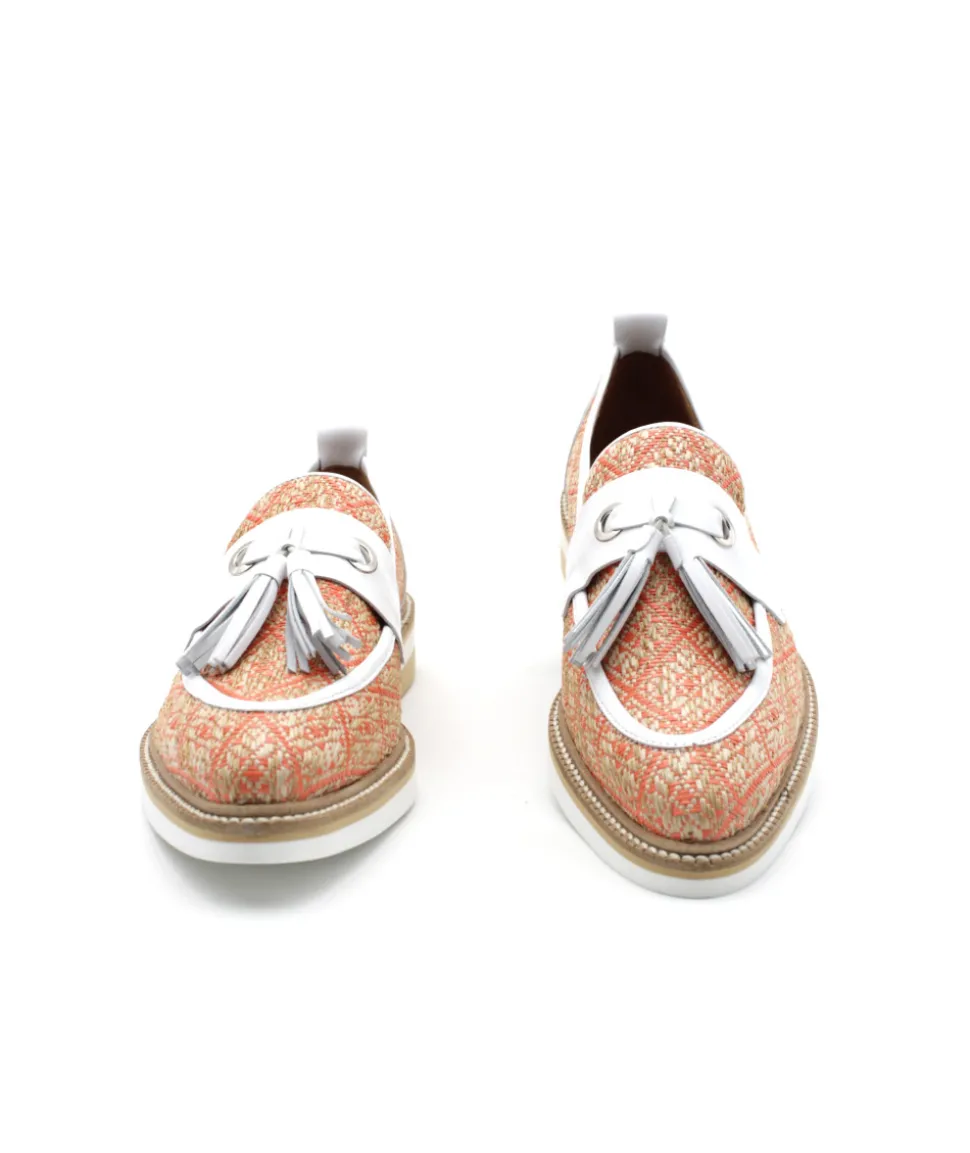 Sublime mocassin hors norme. Une création du designer breton Philippe Morvan en cuir et textile couleur orange associé à des détails blanc pour un rendu ultra élégant ! À porter sans modération, cette chaussure pour femme à la recherche de légèreté et de modernité est le must have de la collection. Chez l’Empreinte on est fan de ce look atypique et des glands présent sur le plateau.