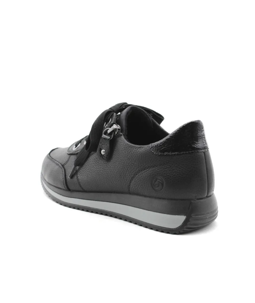 Cette basket Remonte D0H11-01 en cuir noir au look sportswear, en cuir grainé, soulignée par un empiècement vernis sur le contrefort. Parfaite pour assortir toutes vos tenues. Bonus : elle embarque avec elle la technologie Lite’N Soft : Plus de largueur sur la chaussure, semelle amovible, soutien de voute plantaire, légère et souple.