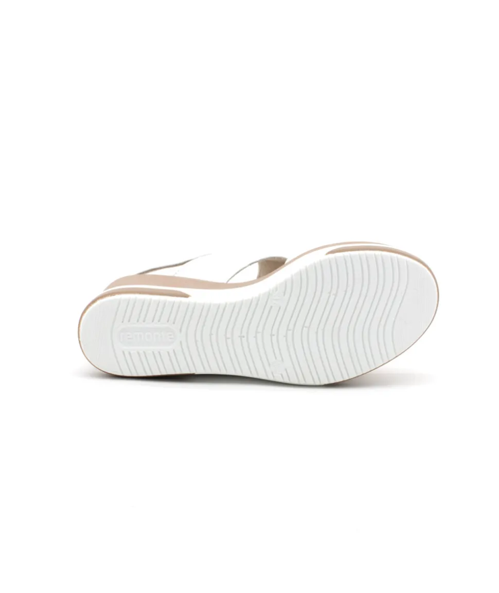 Un modèle qui ne manque pas d’arguments pour vous séduire, voici la nouvelle sandale D1P50-80 de la maison Allemande Remonte. Une sandale en cuir banc équipée d’une bride avant réglable par velcro, une large bride sur le coup de pied pour un maintien optimal, elle-même réglable par un velcro dissimulé sous sa boucle décorative. On l’aime également pour les 6 cm qu’elle nous fait gagner sans douleurs grâce à son plateau avant, sa légèreté et son confort ! Un sans faute !