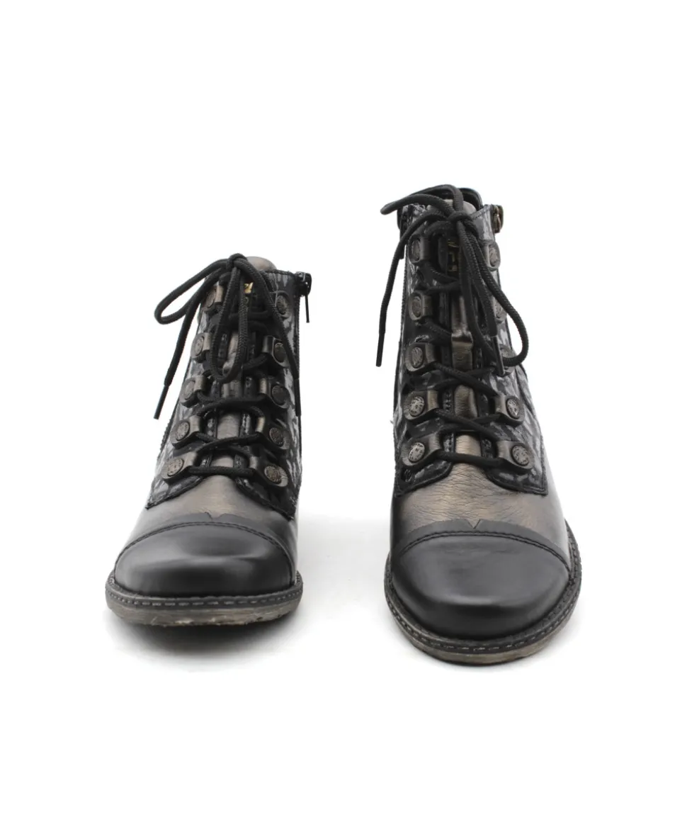 Remonte D4391-02 est une bottine femme en cuir et textile noir. Cette bottine Remonte est facile à chausser grâce à sa fermeture éclair et son lacet. Cette bottine Remonte est doté d’une semelle amovible. Parfaite pour accompagner vos tenues d’hiver. On aime également la tige fantaisie aux détails argentés et son cuir bronze tendance !