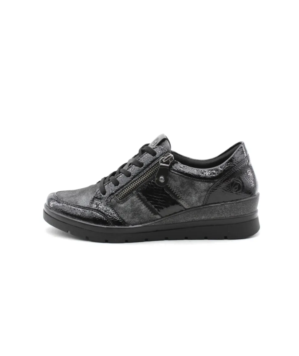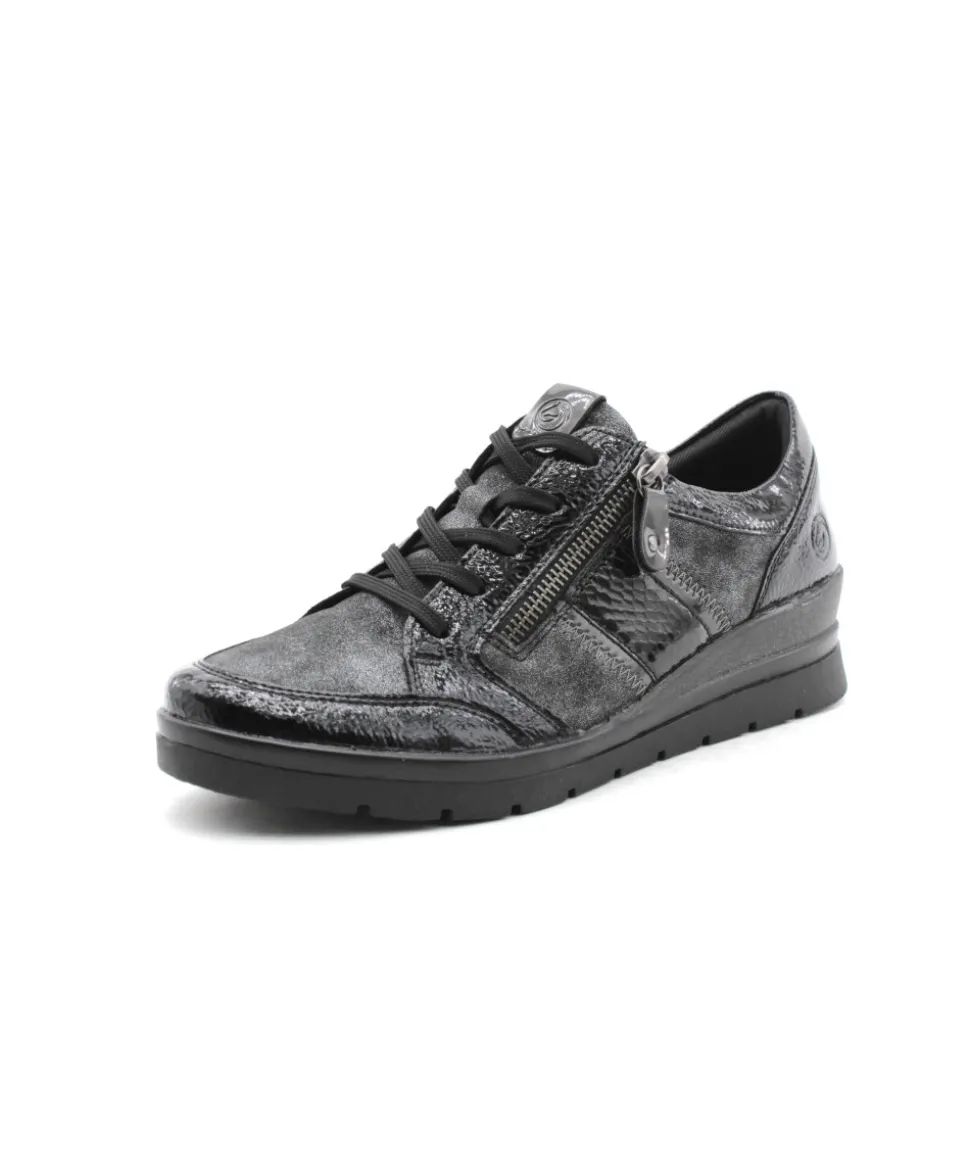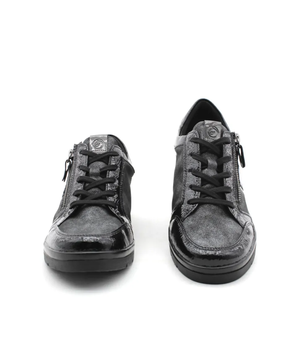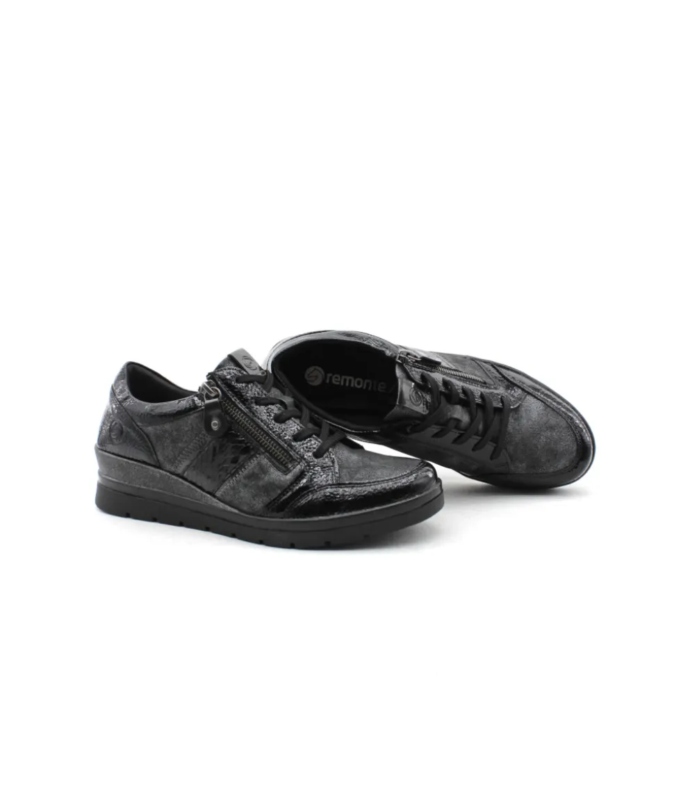 Pour se sentir libre, adopter Remonte !!! Remonte R0705-03 est une tennis noir. Cette tennis Remonte est facile à chausser grâce à son lacet et sa fermeture éclair. Ce modèle de tennis Remonte est doté d’une semelle amovible matelassée. Idéale pour le quotidien avec son petit talon compensé.