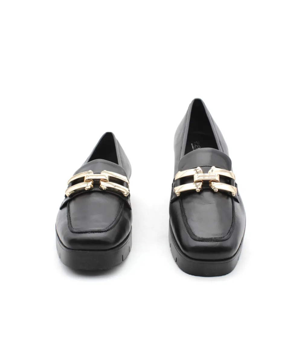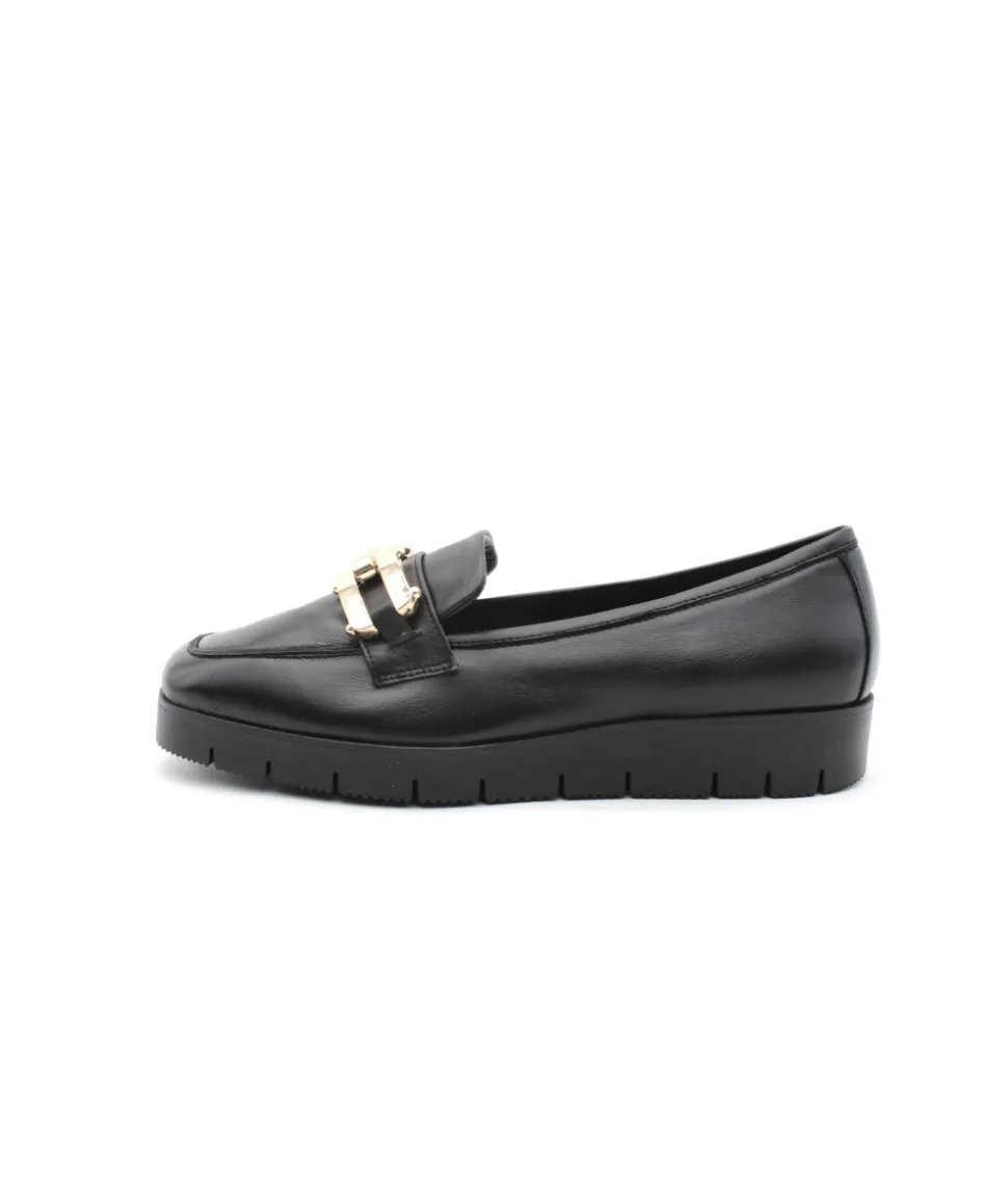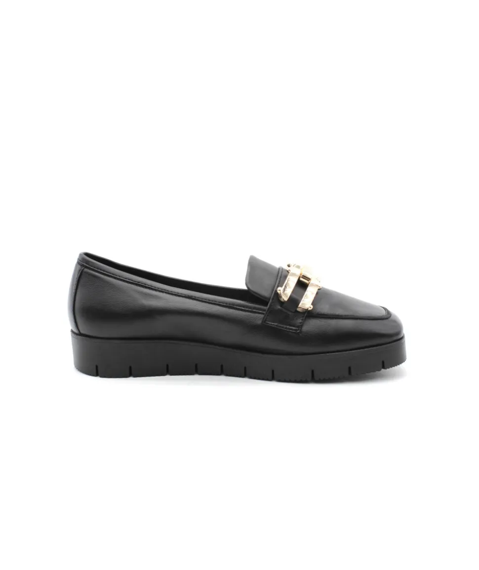 Joli mocassin en cuir noir chic et confortable. L’Empreinte Chaussures vous dévoile le nouveau modèle NEOR de la maison française Reqins et qui plaît déjà aux femmes à la recherche de modernité et d’élégance. Ce mocassin est une véritable pépite avec sa semelle compensée en gomme très légère et confortable ainsi que son mord doré sur le dessus du pied pour un rendu féminin. Un must have de la collection ! N’attendez plus…