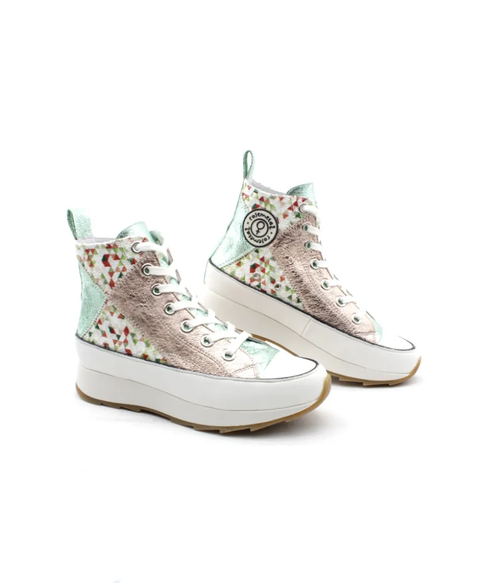 FRECHEDE, une basket ultra-originale pour un look tendance, voici la création de ROSEMETAL. Sur une grosse semelle compensée et une palette de couleur disponible, la mode est à vos pieds ! Une semelle blanche imposante, un dessus en cuir métallisé rose et vert,… pas de doute c’est le must-have de cet saison ! Confortable et looké, on aime le logo sur le côté pour le petit plus !