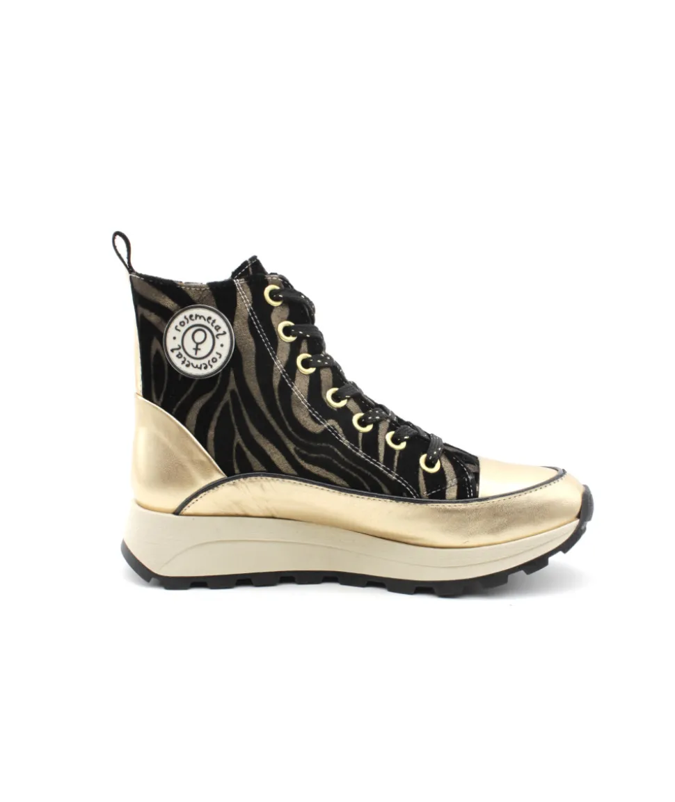 FRESSE H0793I, une basket ultra-originale pour un look tendance, voici la création de ROSEMETAL. Sur une semelle compensée et disponible en cuir noir, bronze et or, la mode est à vos pieds ! Avec une semelle beige imposante, des oeillets et une languette sur le contrefort doré,… pas de doute c’est le must-have de la saison ! Confortable et looké, on aime la portée à toutes les occasions !