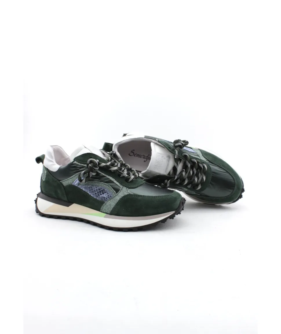 Un mix originale de matière et de couleur pour un rendu atypique ! Voici l’une des créations de la maison Semerdjian avec la basket TYLA 8474 et son cuir vert. Des empiècements en cuir imprimé écaille et bien évidement… la marque de fabrique de la marque : les paillettes ! Montée sur une semelle débordante ultra-tendance en gomme, elle apporte beaucoup de confort à la marche tandis que son lacet original ajustera votre pied dans la sneaker.