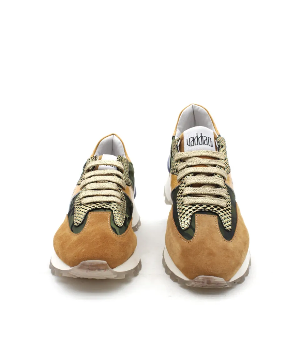 À découvrir absolument, la toute dernière création de la maison portugaise VADDIA avec sa basket ROCCO ultra originale dans son cuir jaune associé à un imprimé militaire, du cuir vernis et du violet. Cette version mélange les couleurs et les matières pour un rendu totalement délirant et atypique qui séduit déjà les modeuses à la recherche d’originalité.