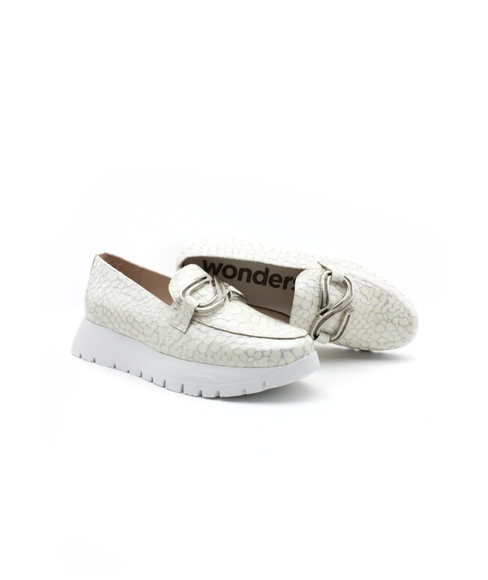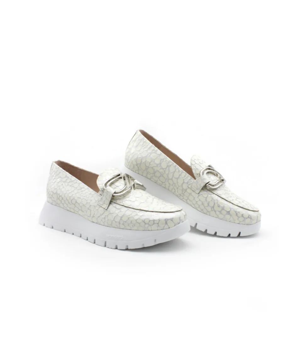 Joli mocassin en cuir orange et serpent argent proposé par la maison espagnole Wonders. Le modèle A2462, une forme bi…