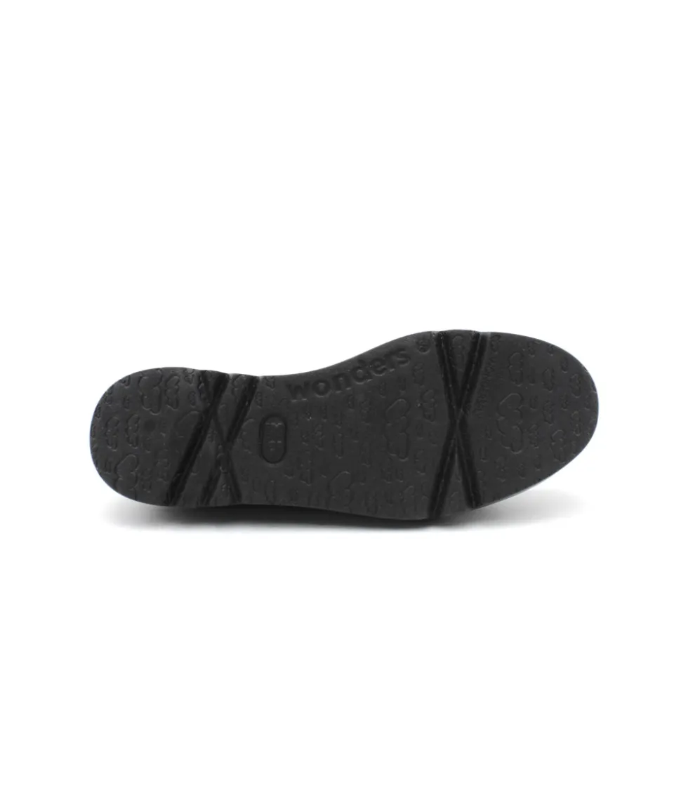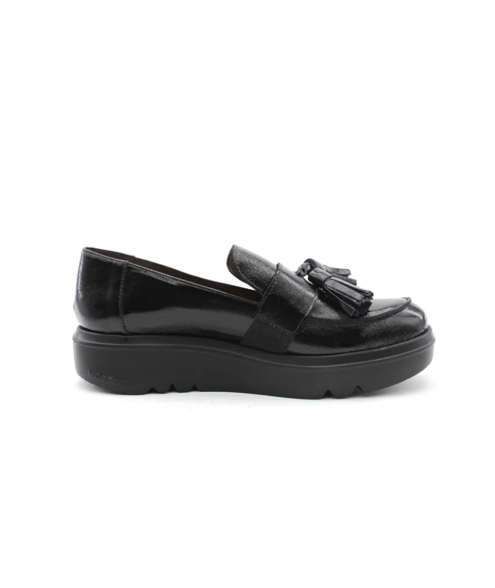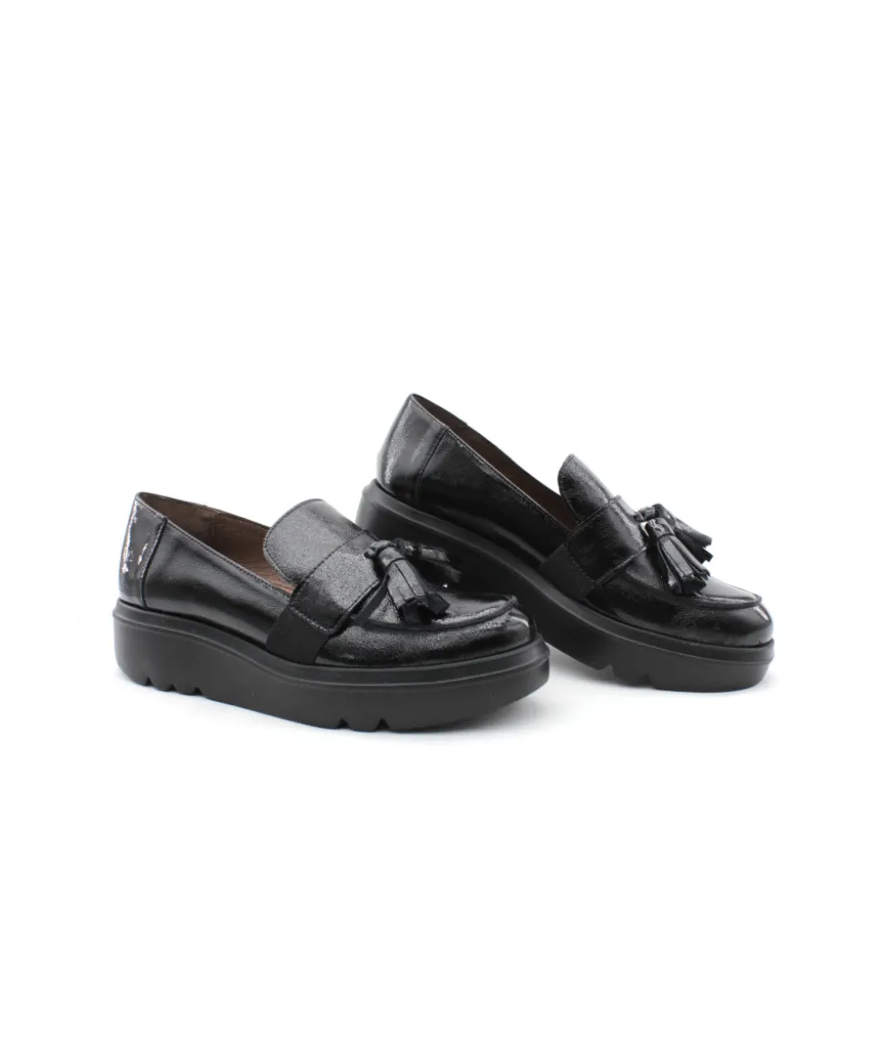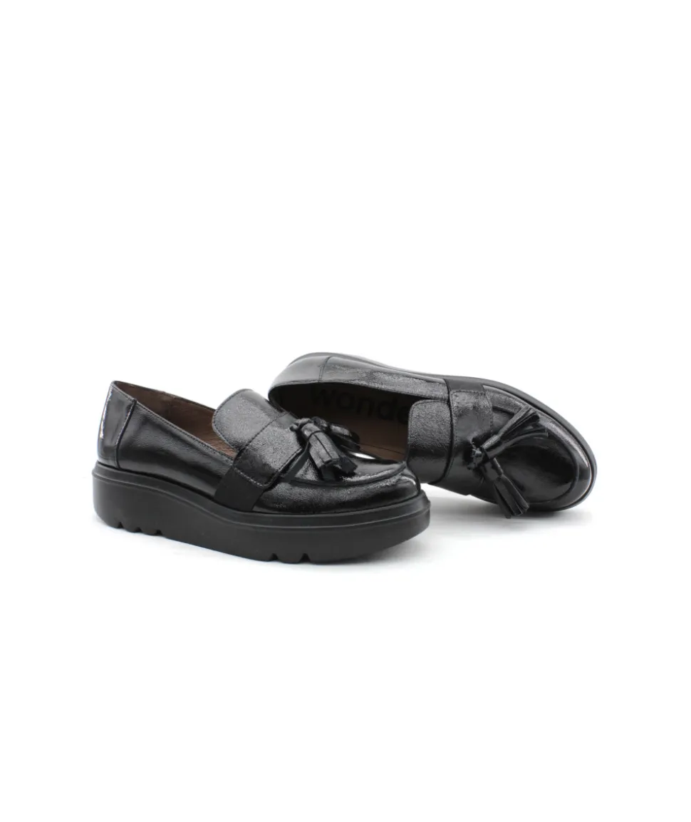 Joli mocassin en cuir vernis écrue et noir proposé par la maison espagnole Wonders. Le modèle A2803 casse les codes pour un look original et atypique, montée sur une semelle compensée, cette chaussure vous accompagnera partout grâce à son confort de marche. On aime les glands en cuir présent sur le plateau avant qui apporte de l’élégance au mocassin.