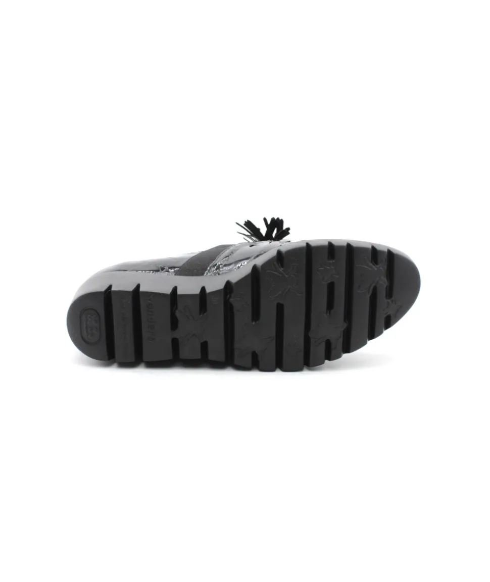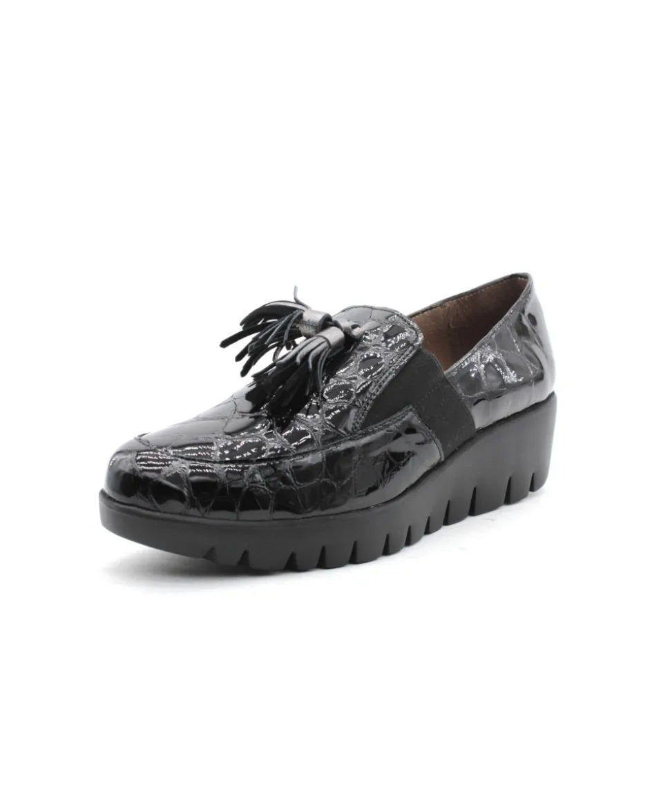 Joli mocassin en cuir vernis noir proposé par la maison espagnole Wonders. Le modèle C33254 casse les codes pour un look original et atypique, montée sur une semelle compensée, cette chaussure vous accompagnera partout grâce à son confort de marche. On aime les glands en cuir présent sur le plateau avant qui apporte de l’élégance au mocassin.