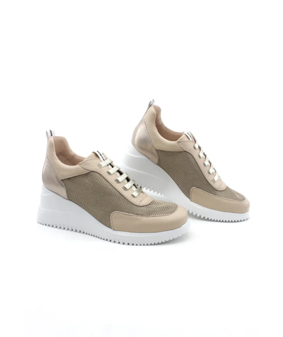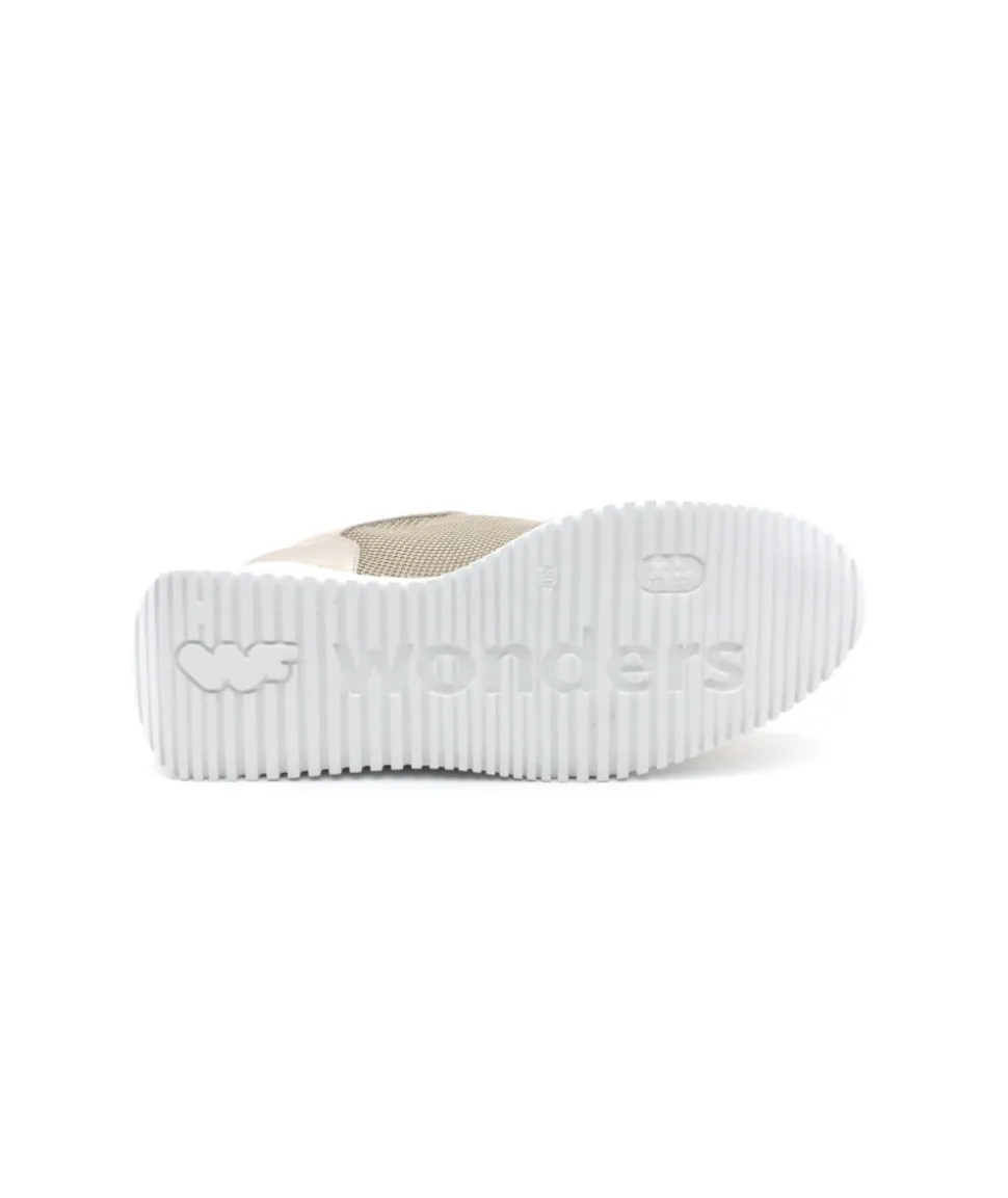 À la recherche d’une sneakers audacieuse qui ne manque pas d’originalité ? Voici pour vous la création G6604 en cuir et toile beige. Un look atypique associé à une semelle blanche au talon imposant, le tout accompagné d’un contrefort couleur or, encore une superbe création de la maison espagnole Wonders. Chez L’Empreinte, on est fan du mélange de matière qui lui offre un style sport chic.