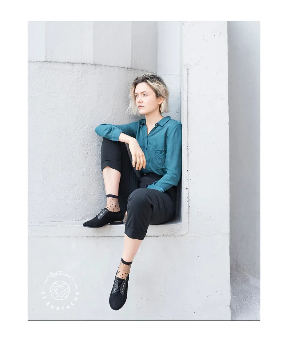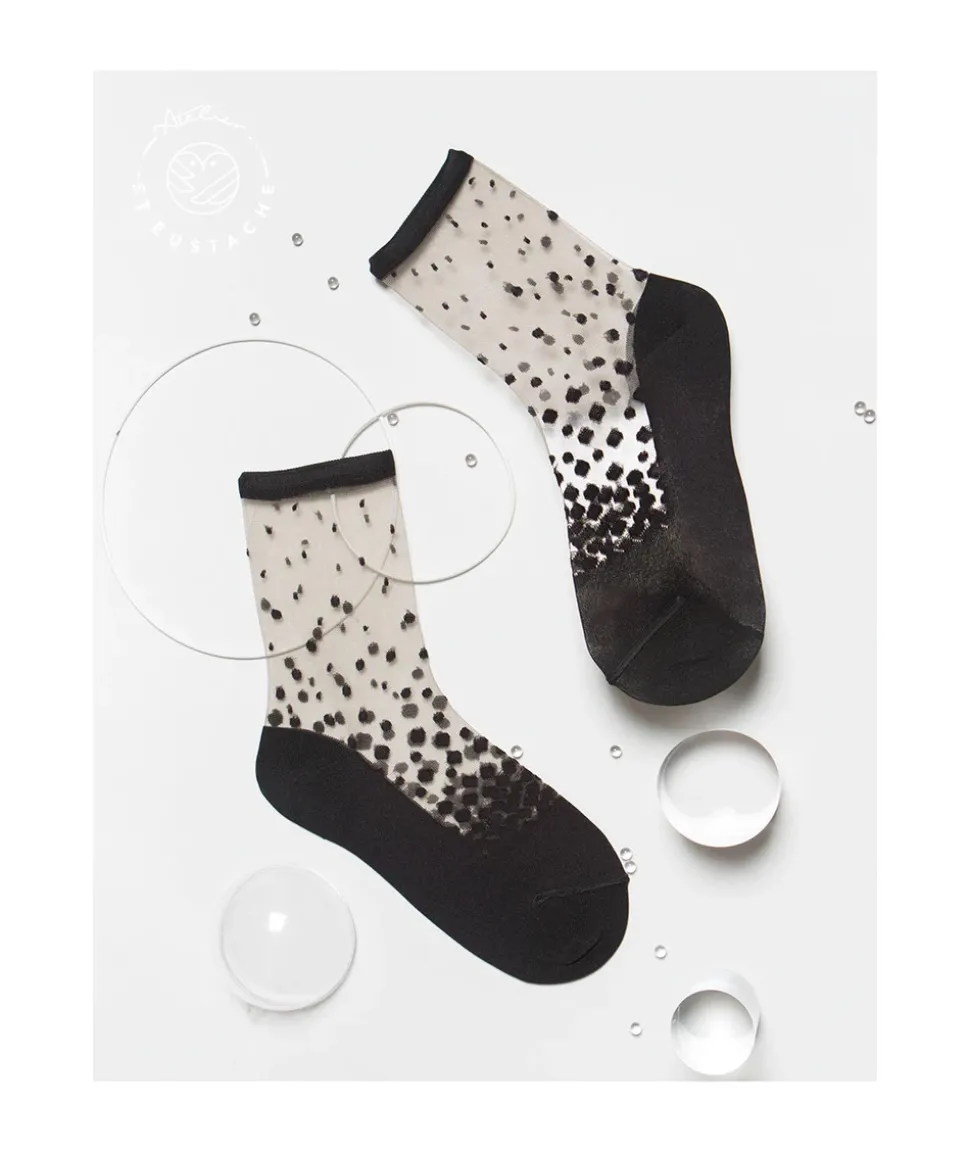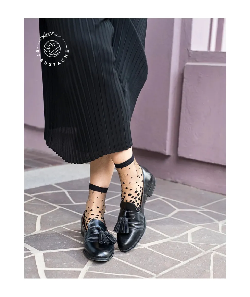 Dégradé de pois noirs sur un fond transparent : le classique plumetis revisité. Idéal autant avec des derbies qu’avec des mocassins ! Inspiré de l’envolée des pétales de cerisier sur le canal de Nakameguro.