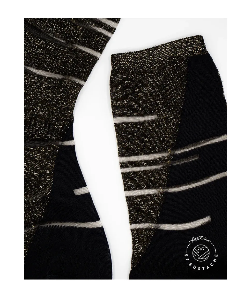 Rayées noires et dorées, ces chaussettes transparentes capteront tous les regards vers vos pieds. Une paire osée mais qui révélera au monde entier votre personnalité. Avec un total look noir, les Tate Modern Gold seront simplement sublimées. Modèle inspiré de la façade du musée Tate Modern.